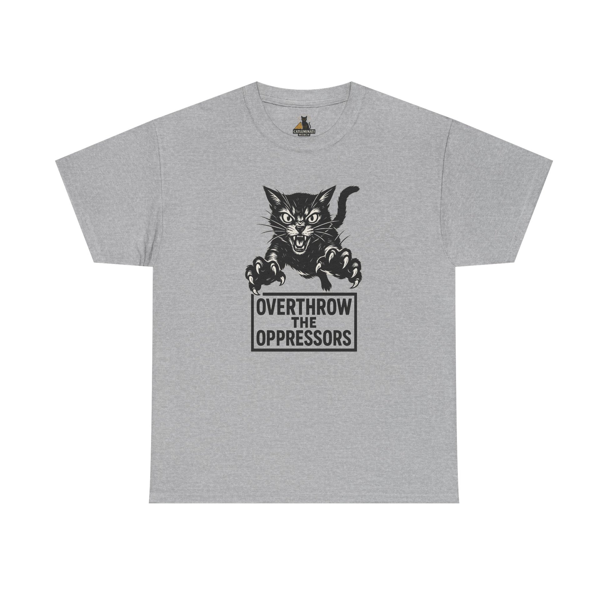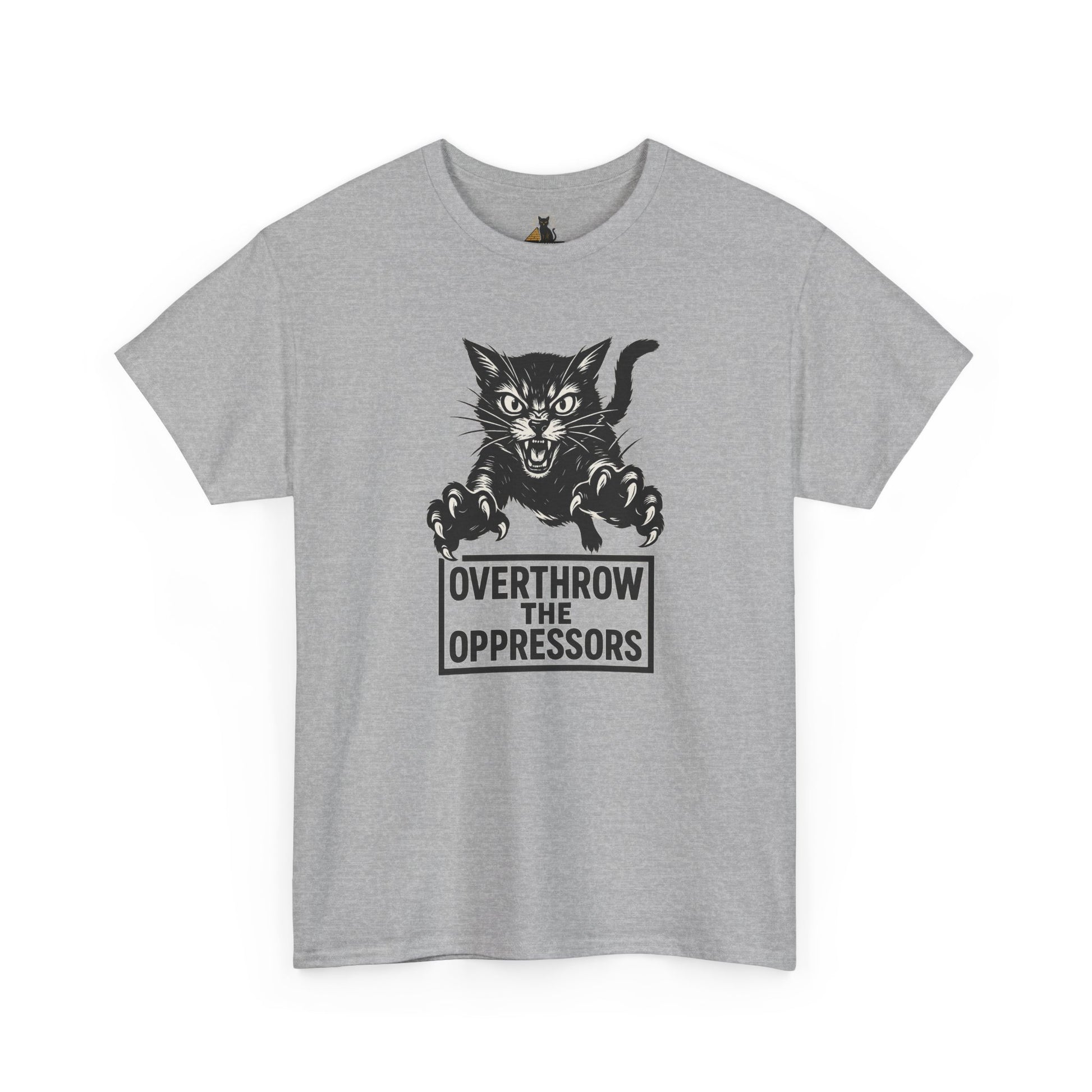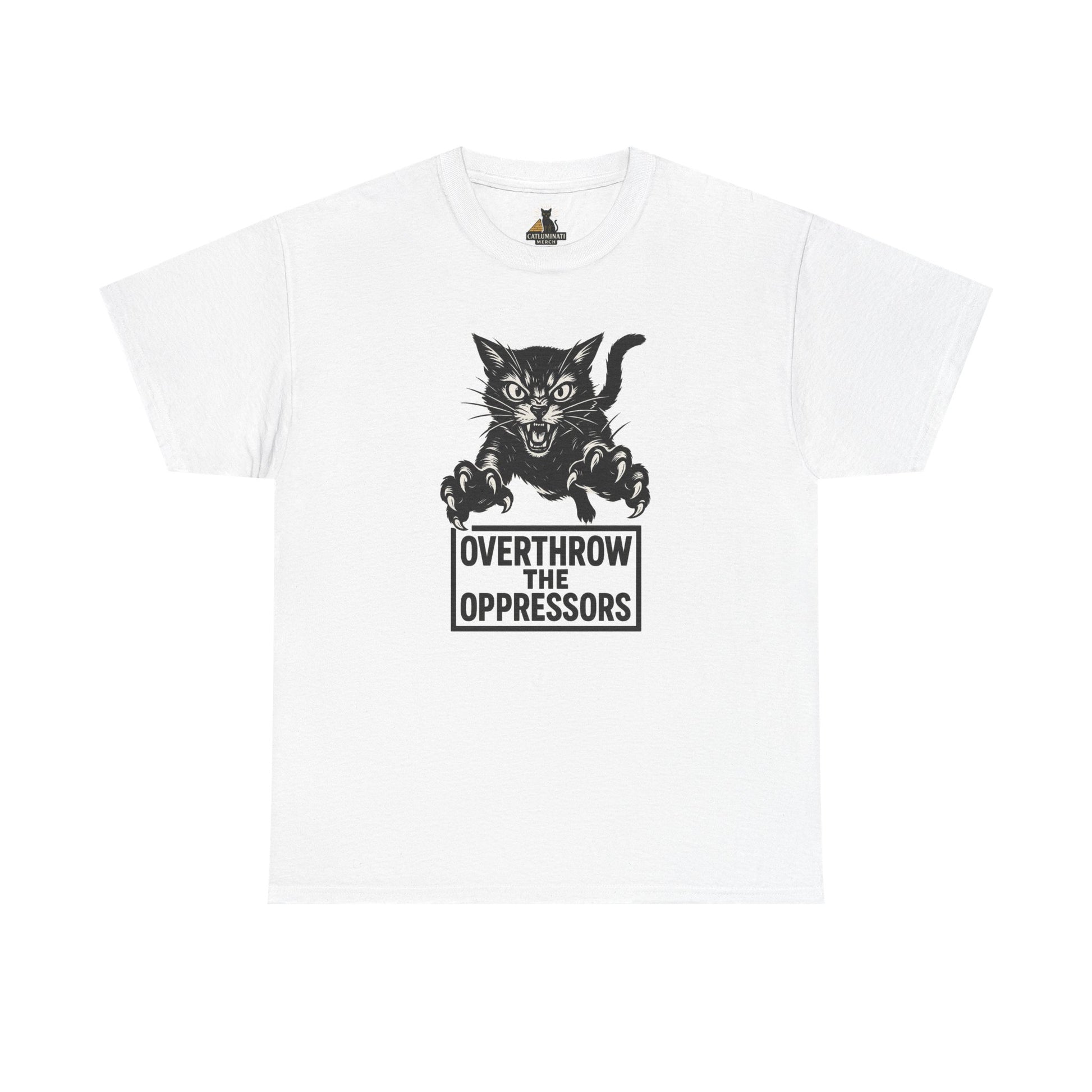 A rebellious T-shirt featuring a cat attacking with the text 'overthrow oppressors'. This shirt exudes a bold and defiant vibe, perfect for those who want to make a statement. Ideal for activists, protestors, and those passionate about social justice. Relevant for protests, rallies, and activist events.